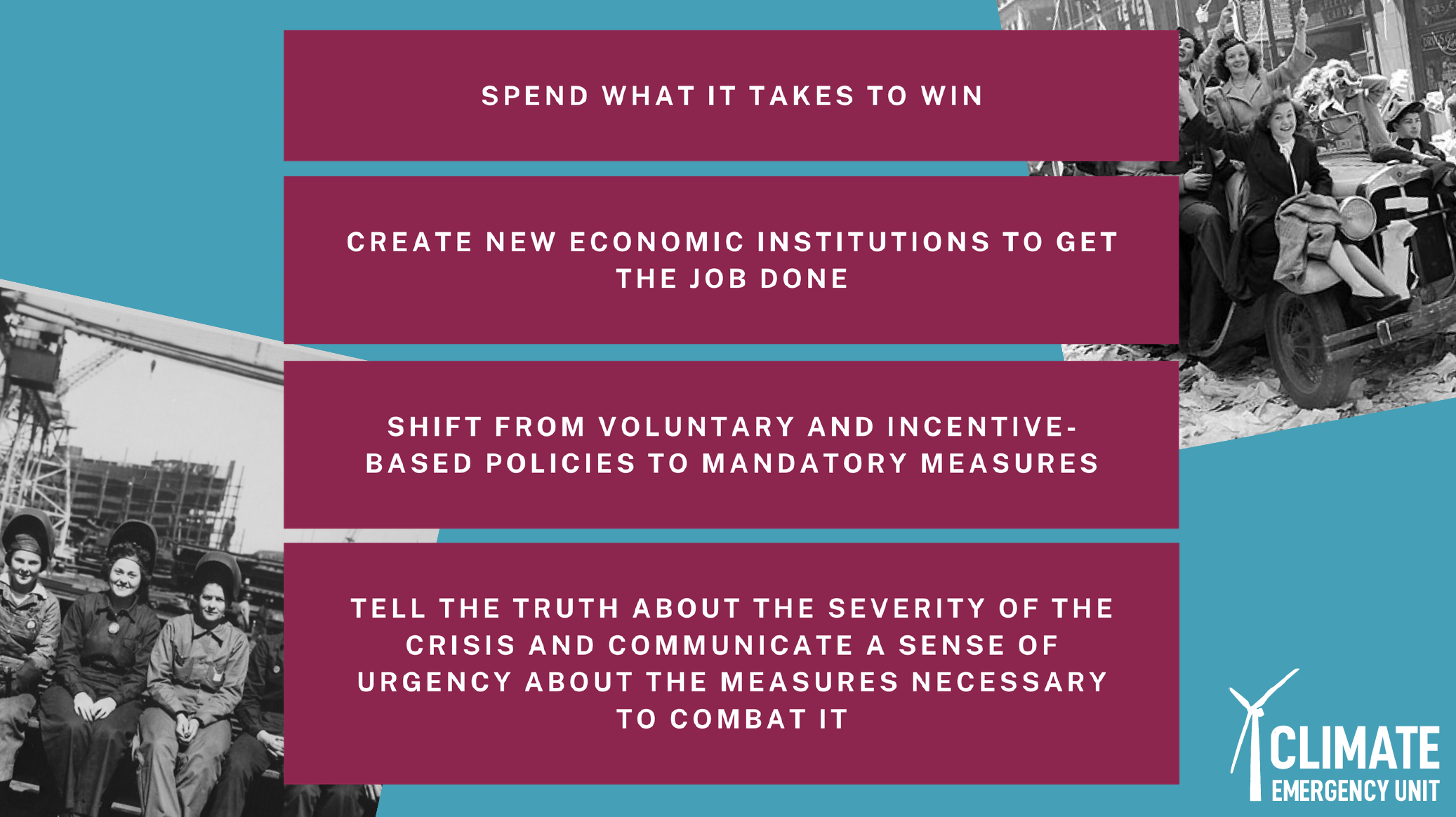 Because almost every climate policy to date is voluntary. For the most part, our governments have sought to encourage and incentivize change, employing price signals and rebates, etc. But that’s not what one does in an emergency. In an emergency, we require certain actions, using clear near-term timelines and regulatory fiat.